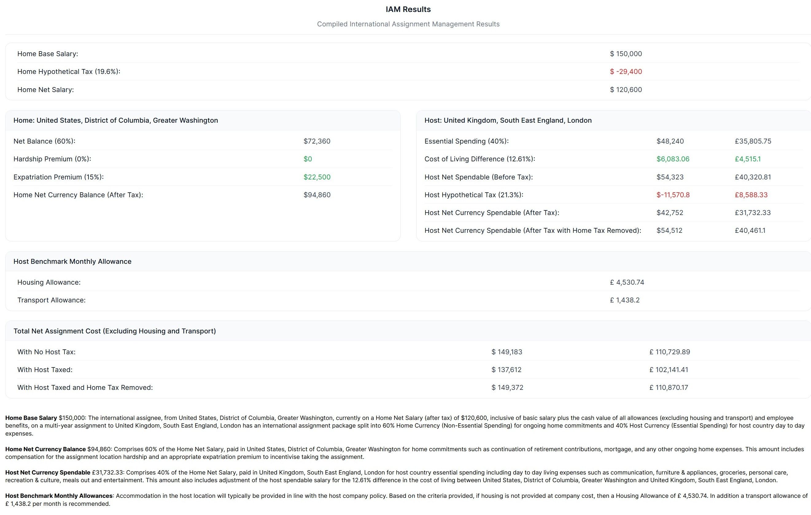 Below is an example of a section of the report for an International Assignment Buildup from Washington DC to London: